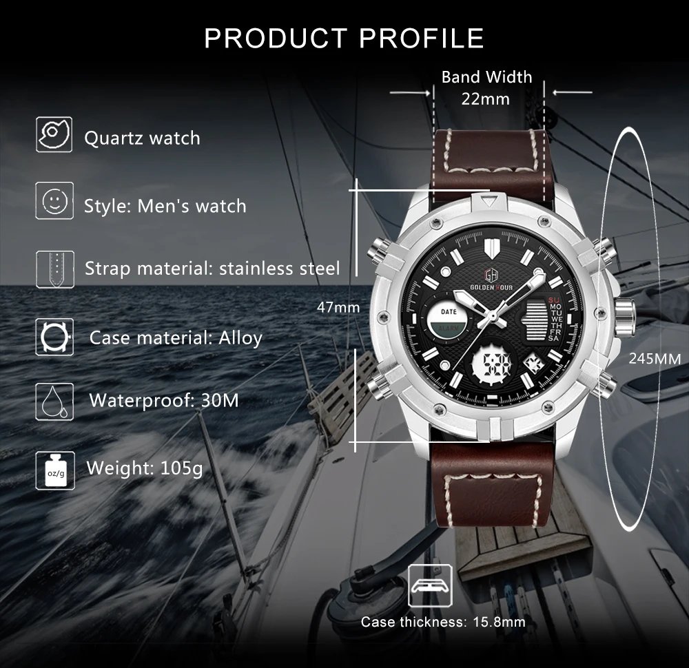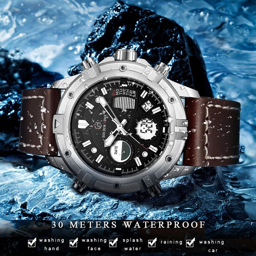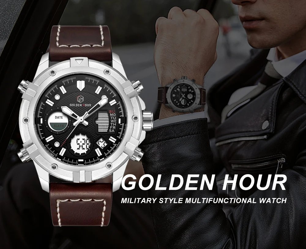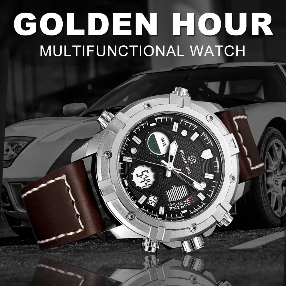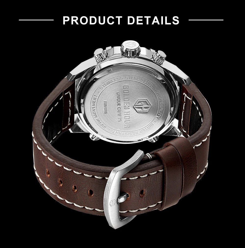 GOLDEN HOUR GH-111  Luxury Waterproof Leather Men Wristwatche